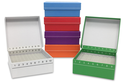 MTC Bio’s new FlipTop™ hinged lid boxes are made of recyclable cardboard, with a liquid resistant outer coating. They are shipped fully assembled with 81 place or 100 place cardboard dividers. Each box has drain slots on the bottom surface and numbered grid markings in almost every conceivable location (top, bottom, sides, etc). Available in white and 5 individual colors, plus a “Rainbow Pack” of 5 assorted colors. Useful temperature range: -196° to +121°C.
